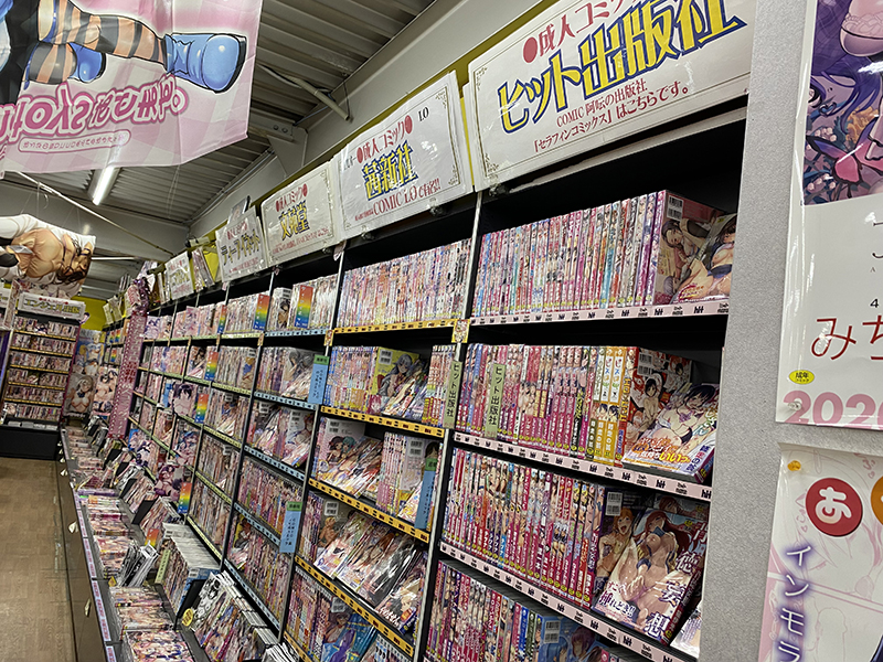 入口入って正面、成人コミックコーナーの最新作棚。 成人コミックはさらに在庫量がございます。このページの下の方もご覧ください。